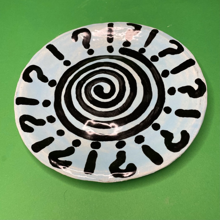 Serve your food on a plate that makes hay of mystery and intensity, which are personified by a swirl surrounded by question and exclamation marks. Life is something else. Each plate is sized 10 (w) x 1 (h) inches.